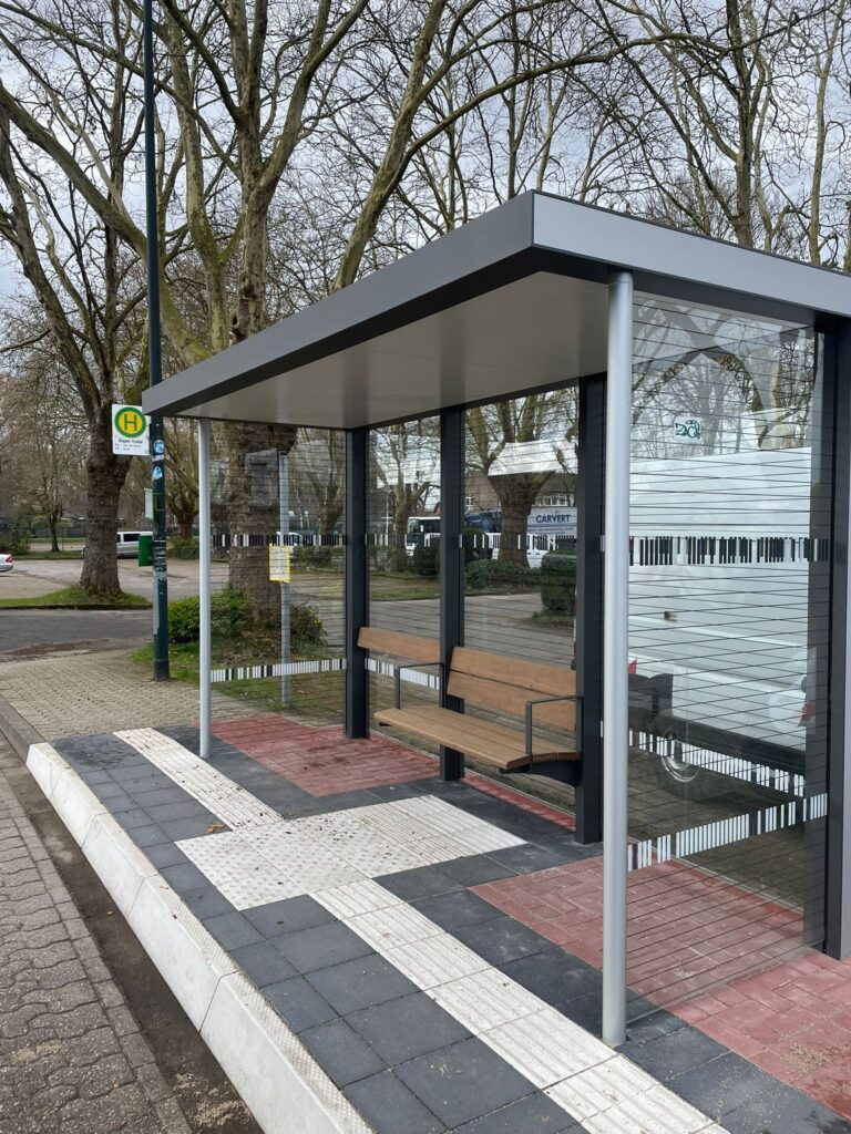 - Im Standard enthalten: Sehbehinderten-Dekor, LED-Leuchte, Solarpanel, Sitzbank, Dachentwässerung und eine Fahrplanvitrine